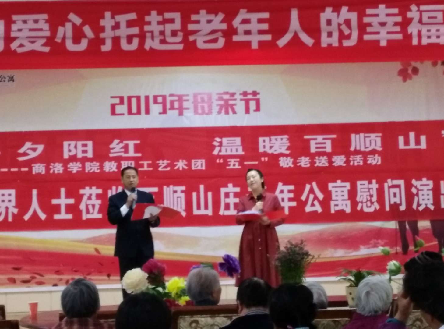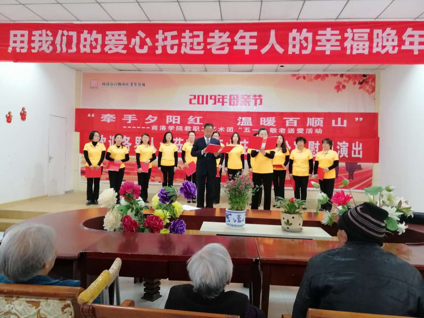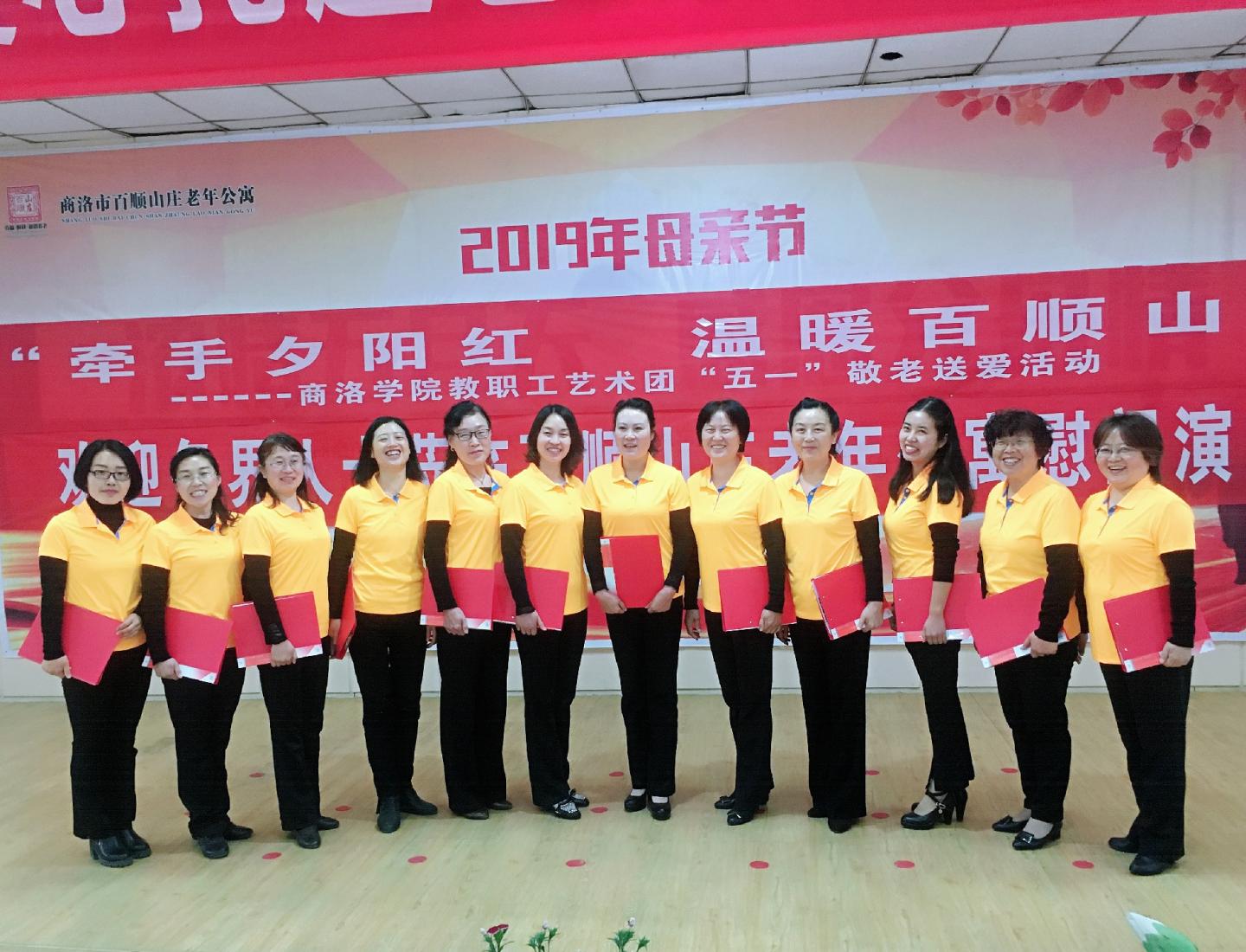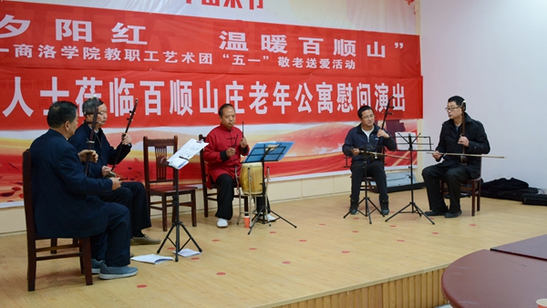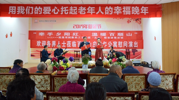 2019年4月27日上午,商洛学院教职工艺术团走进商洛市百顺山庄老年公寓开展“牵手夕阳红温暖百顺山”敬老送爱活动,为老人们演出了丰富多彩的文艺节目,给老人们带了好多松软可口的甜品零食和牛奶等营养品,陪伴老人在欢声笑语中度过了一个愉快的周末。